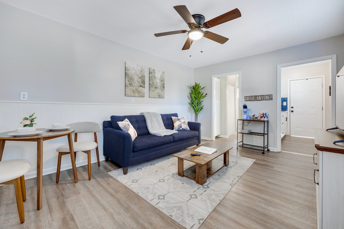 Herrliche Wohnung im Kutschenhaus in der Innenstadt. Neue Wohnzimmer-Hartholzböden! Zu Fuß erreichbar sind Annehmlichkeiten und Attraktionen wie Wildwasser-Rafting und Nachtleben und nur 8 bis 10 Minuten von Fort Benning entfernt. Schöner, geschlossener Innenhof! Dieses Gebäude befindet sich direkt hinter unserem historischen Privathaus und war das ursprüngliche Zuhause für die Kutschen der Familie, wenn sie nicht verwendet wurden. Wir haben unglaublich schnelles 300+ WLAN, Waschmaschine und Trockner sowie Shampoo und Conditioner für deine erste Nacht.