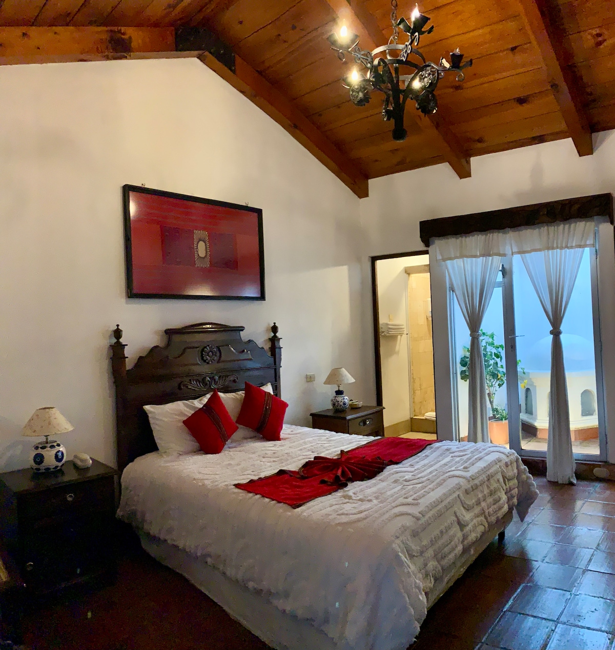 Die Terrassen-Suite: Ein großes, romantisches Zimmer in unserer zweiten Etage mit direktem Zugang zu unserer Terrasse mit Blick auf den Garten und Blick auf die Vulkane Agua und Fuego. - Blick auf die Terrasse - Kingsize-Bett mit hochwertigen Baumwolllaken - privates Badezimmer mit Badewanne und Dusche - Flachbildfernseher SMART-TV (32 Zoll)