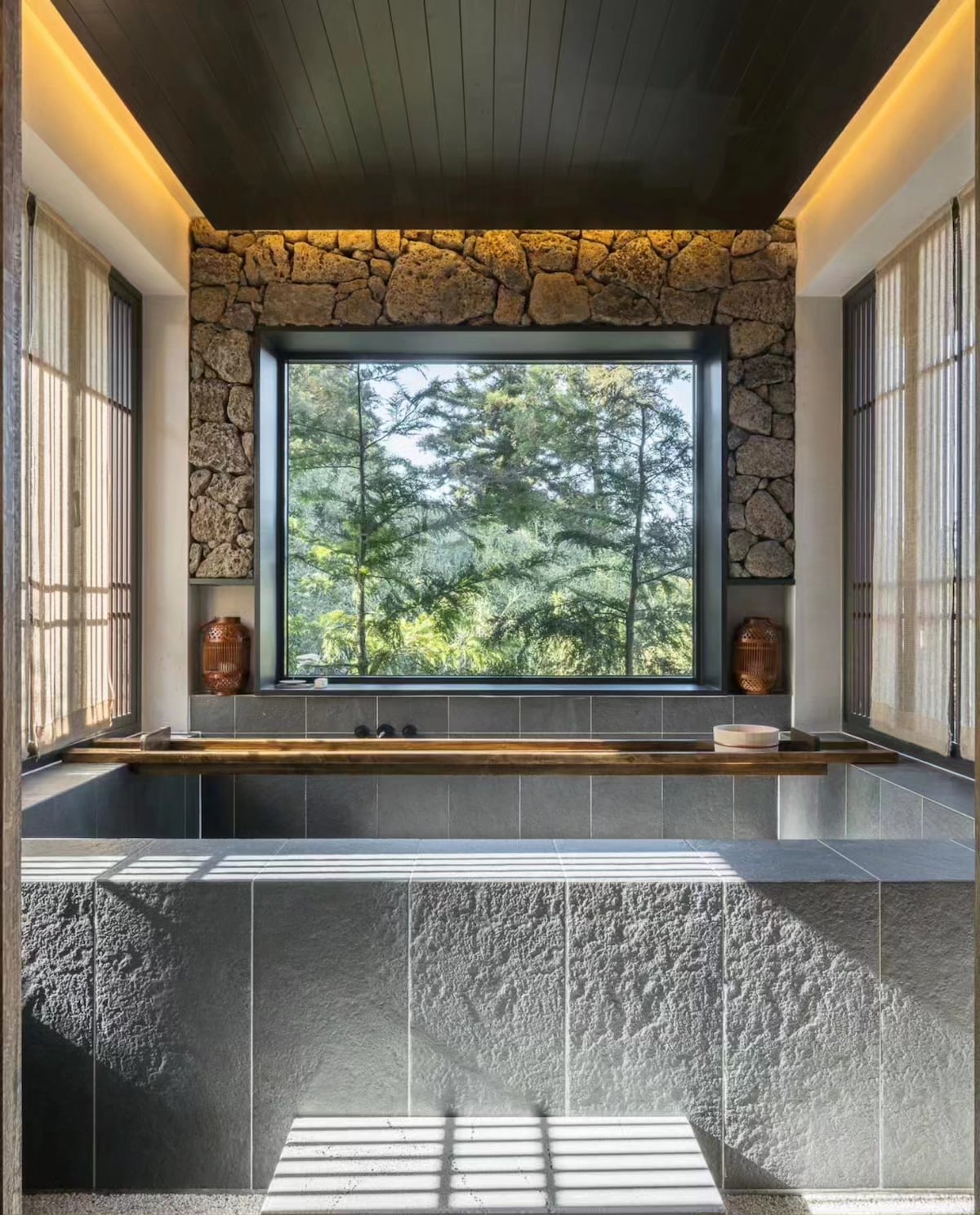 Das Haus der Jahreszeiten in Seogwipo / Ein Whirlpool und ein Esszimmer mit Steinmauer / Ein Haus, umgeben von Orangengärten