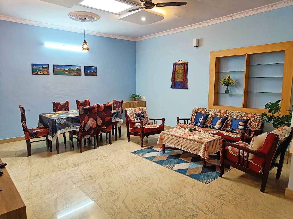 Ein gemütliches und dennoch modernes Einfamilienhaus mit allen grundlegenden Annehmlichkeiten. Das Haus ist 20 Jahre alt und vor kurzem renoviert worden. Die Innenräume sind geschmackvoll eingerichtet, um eine charmante Atmosphäre zu schaffen. Viele der Dekorationsgegenstände werden von uns handgefertigt. Eine 30-minütige Fahrt vom Flughafen Bengaluru entfernt, im Wohnvorort Sahakar Nagar gelegen Der lokale Tempel, Markt, Restaurants, Kneipen, Einkaufsviertel sind alle nur einen kurzen Spaziergang entfernt, vielleicht ein paar Minuten. 10 Gehminuten bis zur Pheonix Mall of Asia!