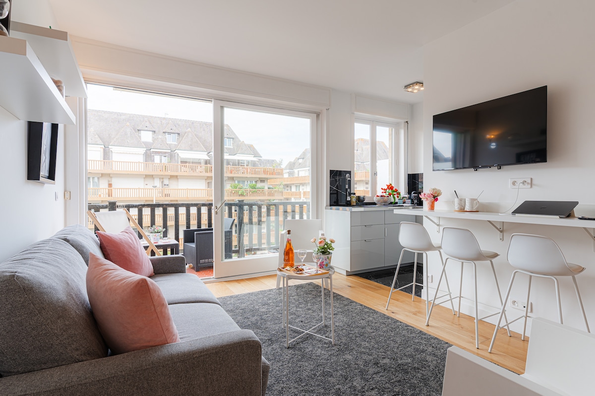 Sehr schönes Studio mit großer Terrasse mit Meerblick. In einer Residenz 10 Minuten zu Fuß vom Zentrum von Trouville und dem Meer entfernt. - Eingang mit Stauraum - Wohnzimmer mit großem Kleiderschrankbett (160 cm) und Matratze in Hotelqualität, Sofa mit Meerblick, Couchtisch, Entspannungssessel, Kabel-TV. WLAN. - Terrasse nach Westen (Sonne am Nachmittag bis zum Sonnenuntergang, den Sie von der Terrasse aus genießen können) - Ausgestattete Küche - Badezimmer mit Dusche und großem Waschbecken, WC.