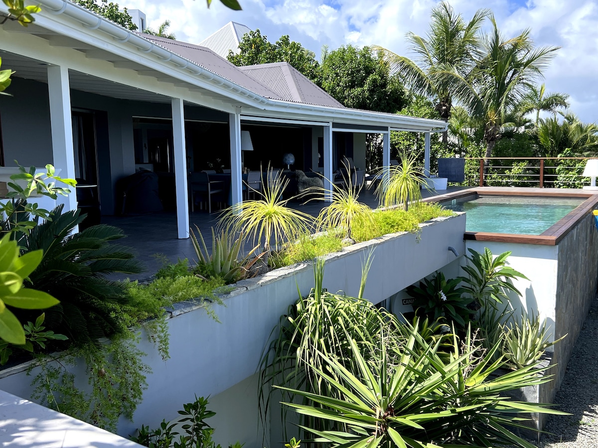 Freistehende Villa, eingezäunt mit elektrischem Tor, Garten von 1000 M2, auf den Höhen von Devet (Südostinsel, 7 km von Gustavia und 15 Minuten vom Flughafen entfernt. Herrlicher Meerblick mit Blick auf die Strände von Toiny und Petit Sackgasse. Mehrere Strände 2 Autominuten, Hotels und Restaurants in unmittelbarer Umgebung. Privater Pool ohne gegenüber. Sehr ruhige Lage. Villa komplett ausgestattet für deinen Komfort, WLAN mit Glasfaser, Fernseher, Satellit. Netflix.