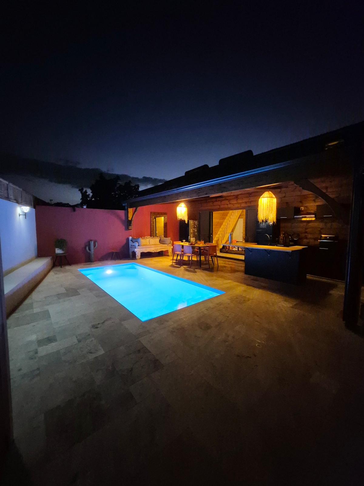 Charmante villa sans vis à vis avec piscine privé au sel 5,90x2,55, capacité : 4 personnes + enfant, 2 chambres climatisées lit 160x200 + brasseurs d’air, 1 cuisine + séjour avec canapé 90x200, 1 terrasse et petit jardin. Située à 1,8 km en voiture du port de plaisance de St Gilles et la plage des roches noires, 2,5km de la plage de l’hermitage. Vous profiterez d’un endroit idéal proche des plages de l’ouest et des axes routiers pour visiter l’île. Un carrefour city, une pharmacie … à pe