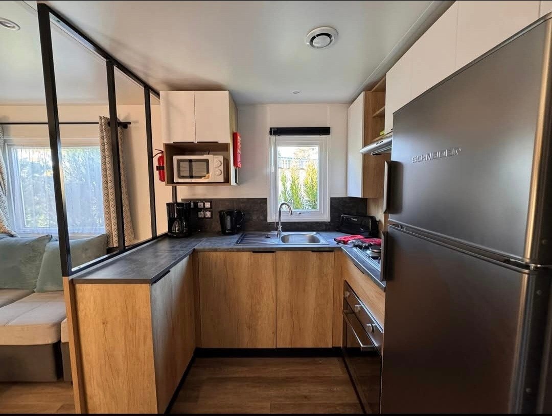 Mobilheim Premium (44m2) klimatisiert für 4/6 Personen auf einem Grundstück ohne Gegenüber auf einem Campingplatz 4* siblu Bonne Anse Plage Sehr geräumiges und helles Wohnzimmer, bestehend aus einer Küchen- /Essbereich und einem Wohnzimmer mit umwandelbarem Ecksofa 1 Elternschlafzimmer Bett 160cm mit Einbauschränken mit Badezimmer 1 Schlafzimmer mit Einbauschränken, ausgestattet mit 2 Betten 80 1 Badezimmer mit 1 Waschbecken, geräumige Dusche, WC, Handtuchtrockner Überdachte Terrasse von 15m2 mit Plancha, kostenpflichtiges WLAN