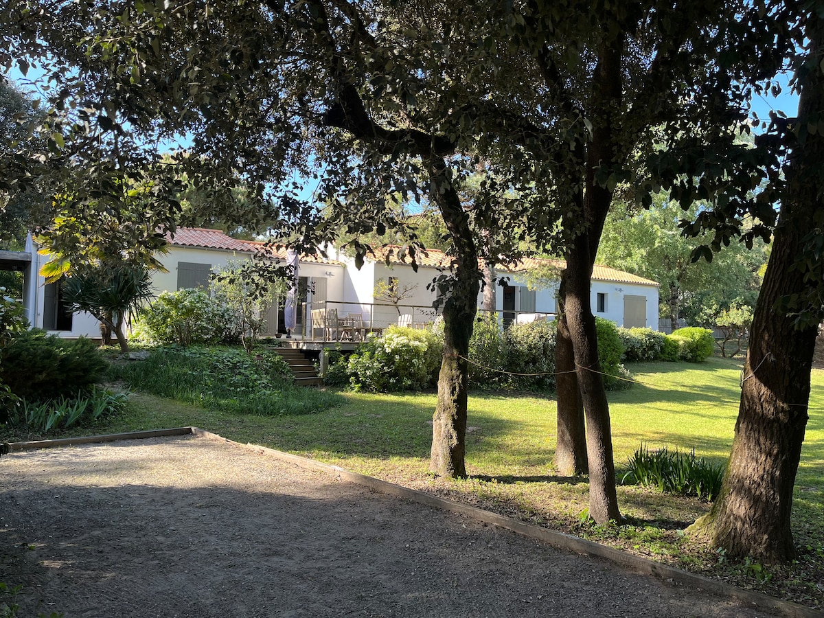 Située au Nord Ouest de l'ile d'Oléron, au calme, belle villa de 136 m2 avec grande terrasse ombragée, terrain (1500m2) dans foret domaniale, 400m de la grande plage de Chaucre. Terrain de pétanque privatif, barbecue, plancha et vélos (5) il y a possibilité de louer une partie de la maison (cuisine SAM 2chambres 3 lits SDB wc) hors vacances scolaires et week-end ascension Pâques 1er mai 8 mai …..140 € la nuit nous contacter. Commerces à proximité.