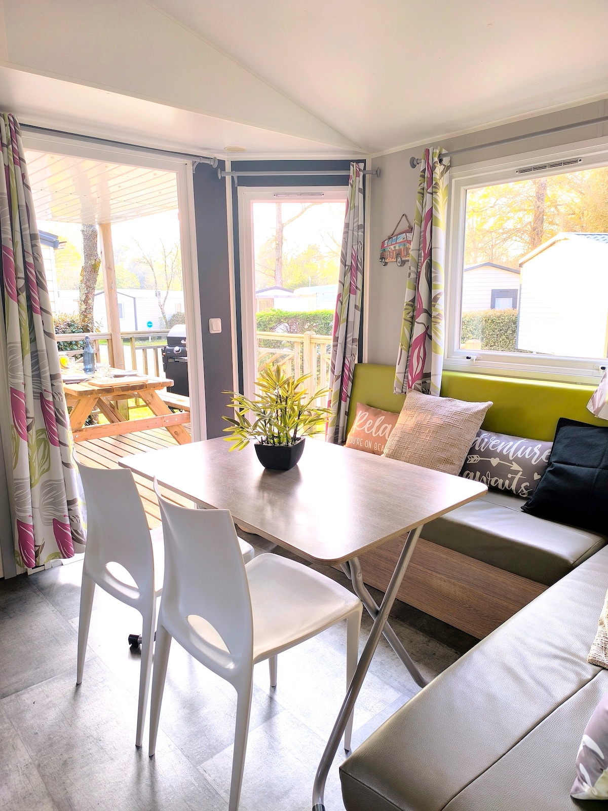 Entspannen Sie sich in dieser ruhigen und eleganten Unterkunft (neues Mobilheim) auf einem angenehmen 4-Sterne-Campingplatz. Große L-förmige Terrasse.
