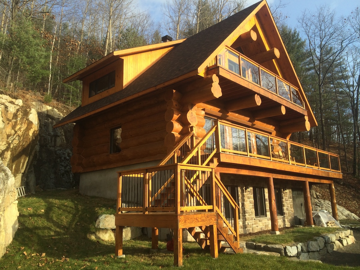 Unser nordisches Waldchalet ist perfekt geeignet, um Zeit zu zweit (oder mit einem Kind) oder für ein Work-Retreat (mit Highspeed-WLAN) zu verbringen. Das Holzinterieur ist warm und gemütlich. Die Fenster in voller Höhe bieten einen atemberaubenden Blick über ein bewaldetes Tal. Die offene Küche und das Wohnzimmer halten dich beim Kochen im Gespräch. Wenn du lieber draußen kochen möchtest, gibt es eine Feuerschale mit Grill und Esstisch im Freien. Nur 70 Fahrminuten von Montreal entfernt. Der See ist 25 Gehminuten entfernt, wenn Sie in der Nähe parken.