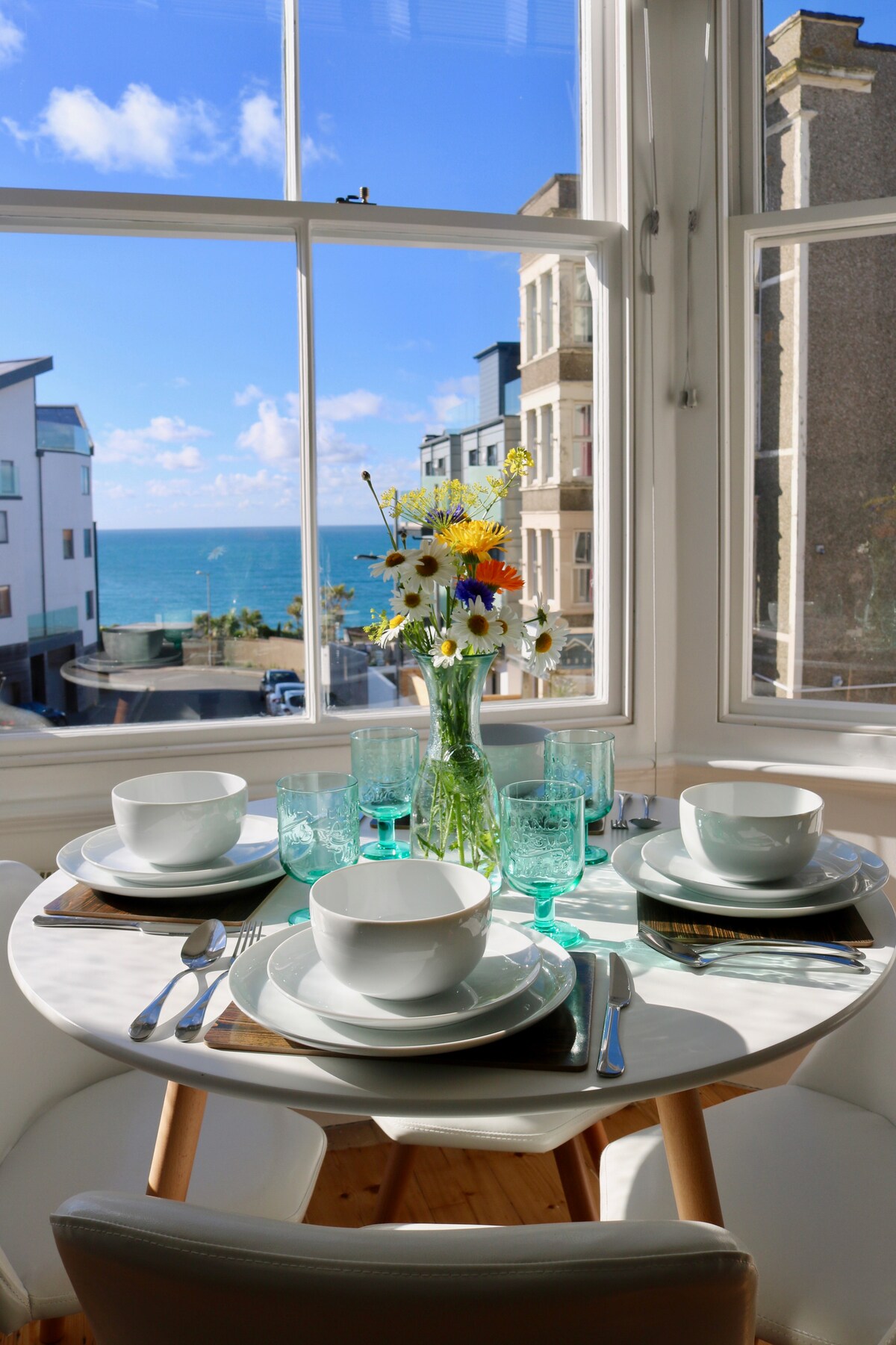 The sweeping coastal view from our town centre apartment is the same one described by Virginia Woolf in her novel To the Lighthouse, inspired by summers in St Ives: 'as far as the eye could see, fading in soft low pleats, the green sand dunes, running away into some moon country'. Quietly tucked away, the apartment is ideally situated for summer and winter breaks, and remote working. The harbour is a two minute stroll, Porthmeor and Porthminster beaches a short walk. Sorry no pets. No smoking.