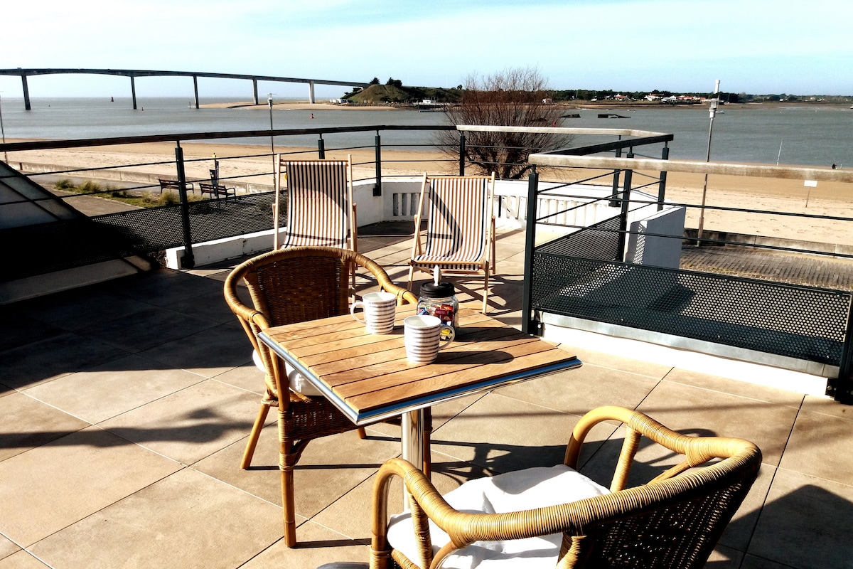 Große Dachterrasse von 60 m2 mit Meerblick, idealer Ort zum Entspannen und Genießen der herrlichen Aussicht auf das Meer und Noirmoutier. Idealer Ort, um neue Energie zu tanken und einfach das Meer, seine Fischerboote und Vergnügungsboote zu beobachten. Erkerfenster am Fußende des Bettes, außergewöhnliches Erwachen mit dem Rauschen der Wellen! Außergewöhnliche Umgebung, Strand davor, die Promenade von Fromentine ist nur für Fahrräder und Fußgänger erlaubt. Bett bei Ihrer Ankunft gemacht, Handtücher. Plancha.