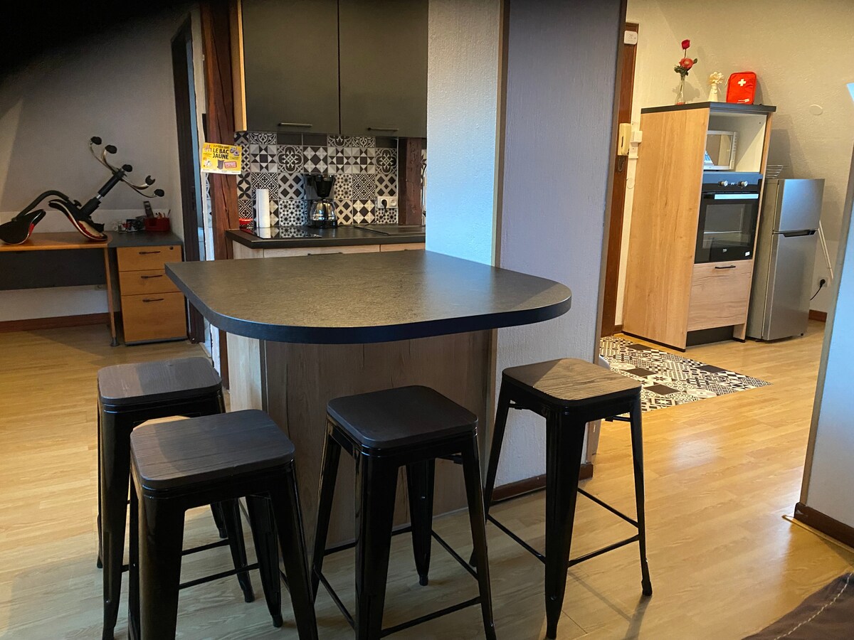 Appartement meublé,mansardé,40 m2 comprend:une chambre,lit double (140 *190),une armoire.Salon,un canapé convertible(140*190),table basse,TV,box,Wi-Fi.cuisine équipée : frigo, plaque vitro,lave vaisselle,four,micro-onde, machine à café,bouilloire,grill pain, vaisselle,table,4 tabourets.Salle d 'eau avec cabine douche,lavabo et wc.Un Espace Bureau. 1 Petit déjeuner offert:café,beurre,confiture,thé, biscottes,céréales (pour les enfants)Appartement Proche du:centre ville,marché,axes auto routier.