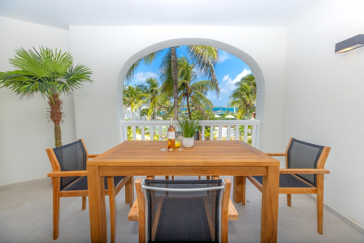 Am Strand! Luxuriöse Villa Marina, herrliche Aussicht auf das Meer, Wohnung komplett renoviert und mit dem Charme der Inseln eingerichtet, ein echtes kleines Juwel am Rande des Karibischen Meeres, ideal gelegen in einer sicheren Residenz (Nachtwächter) 4 Pools, 2 Tennisplätze, Strände, Restaurants in der Nähe von Supermarkt, Bäckerei, Weinkeller, Wasser S.Club Tauchen, Kajak, Jet Ski, Restaurants, Strandbar, 14 Minuten vom Flughafen Princess Julianna, 8 Minuten von Marigot