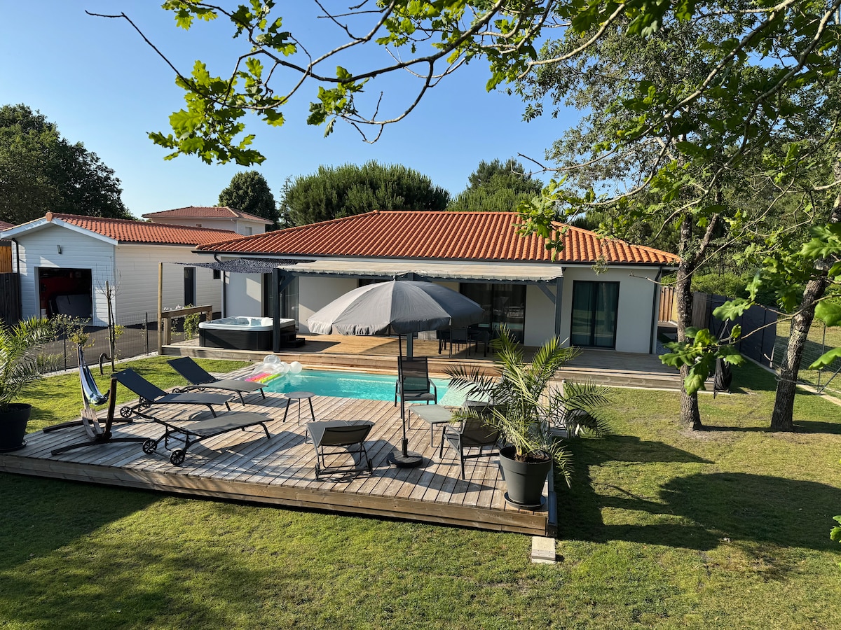 Wunderschönes neues und komfortables Ferienhaus in Mimizan Plage (bis zu 5 Personen). Es liegt in einer grünen Umgebung, inmitten von Pinien und in der Nähe des Meeres. Wir stellen Ihnen Fahrräder für die Dauer Ihres Aufenthalts kostenlos zur Verfügung. Das Haus ermöglicht es Ihnen, einen unvergesslichen, erholsamen Urlaub in der Natur zu verbringen, ruhig und nur wenige Minuten mit dem Fahrrad entfernt, können Sie die vielen sommerlichen Aktivitäten am Strand (Markt, Geschäfte, Restaurants, Bars und Jahrmarkt) genießen.