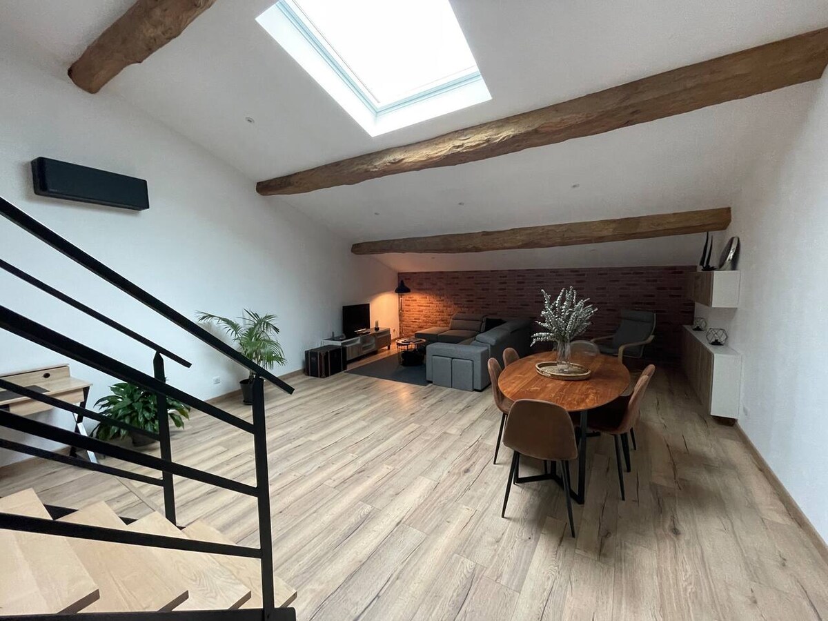 Entspannen Sie sich in einer alten, renovierten, eleganten und ruhigen Scheune, nur einen Katzensprung vom Canal du Midi und dem Herzen von Castelnaudary entfernt. Entdecken Sie den einzigartigen Charme dieser Maisonette, die dank eines Codes unabhängig zugänglich ist. Ideal für einen romantischen Kurzurlaub, einen Geschäftsaufenthalt oder eine Familienreise, diese Unterkunft ist so konzipiert, dass sie Komfort und Ruhe bietet.