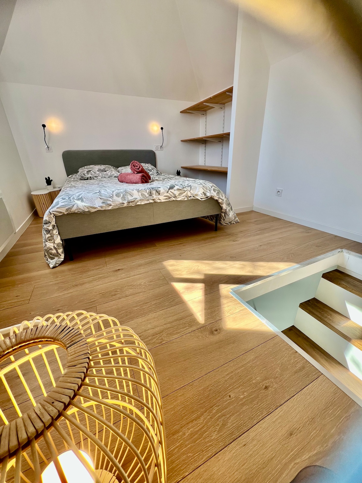 Suite élégante avec entrée indépendante, pensée pour un séjour confortable et sans contrainte. Vous découvrirez un studio moderne et chaleureux, mêlant bois naturel et éclairages doux pour une atmosphère immédiatement agréable. Literie haut de gamme, épaisse et confortable pour une bonne nuit de sommeil, salle d’eau soignée, Wi-Fi rapide, arrivée autonome : tout est réuni pour que vous vous sentiez bien dès votre arrivée, que ce soit pour une escapade à deux ou un déplacement professionnel.