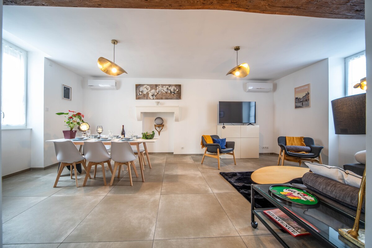 Dieses klimatisierte Loft ist einzigartig, es befindet sich im Herzen des historischen Zentrums und ist dennoch ruhig am Ende eines Innenhofs in unmittelbarer Nähe der Hospices. Es hat einen unglaublichen Blick auf den Place Carnot und sogar auf den Glockenturm der Hospices. Wir haben es komplett renoviert und mit edlen Materialien von hoher Qualität eingerichtet. Beeindruckende Kathedralendecke von 6 m Höhe, sehr hell. Kostenlose Parkplätze in der Nähe, Restaurants und Geschäfte auf dem Platz. Voll ausgestattet und Ankunft rund um die Uhr