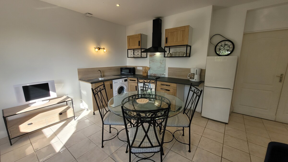 Gîte de charme contemporain très lumineux, de plein pied donnant sur une terrasse privative végétalisée avec une belle exposition au soleil. Détendez vous dans ce gîte élégant, avec entrée et parking privatif. Chambre avec lit 160/200 (linge de lit fourni) salle d'eau à disposition gel douche, shampoing, sèche cheveux, drap de bain fournis et toilette indépendant. Cuisine équipée, (four, plaque de cuisson, réfrigérateur, bouilloire, machine à café, grille pain, lave vaisselle, micro onde )