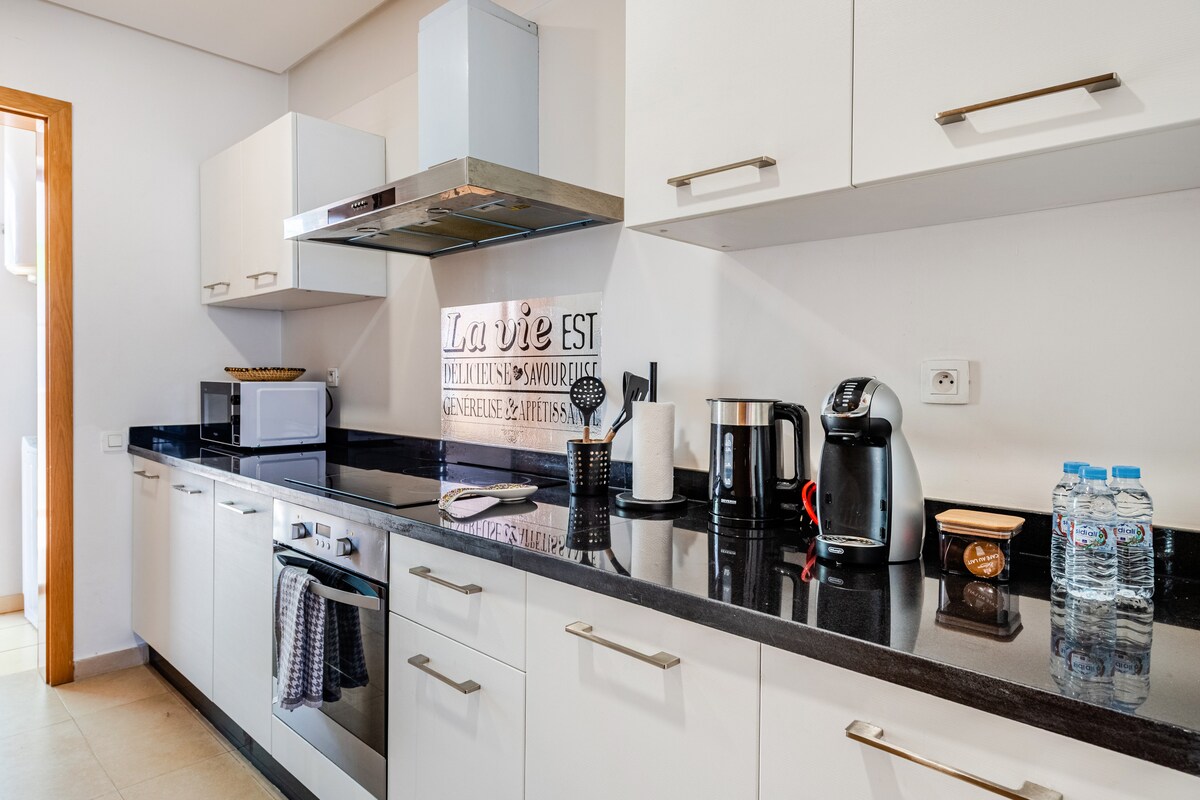 Appartement haut standing, neuf, moderne et décoré avec un style hôtelier. 2 chambres, 3 balcons, clim centralisée dans toutes les pièces Wi-Fi fibre 200 Mb/s, TV 4K QLED 55 avec Netflix. Résidence calme, sécurisée 24h/24 avec parking sous-sol et ascenseur. Literie confortable, douches à l’italienne, coin café avec cafetière et machine Nespresso (Capsules offertes). Électroménager de qualité. Shampoing et gel douche ainsi que des serviettes microfibres qualité premium à votre disposition.