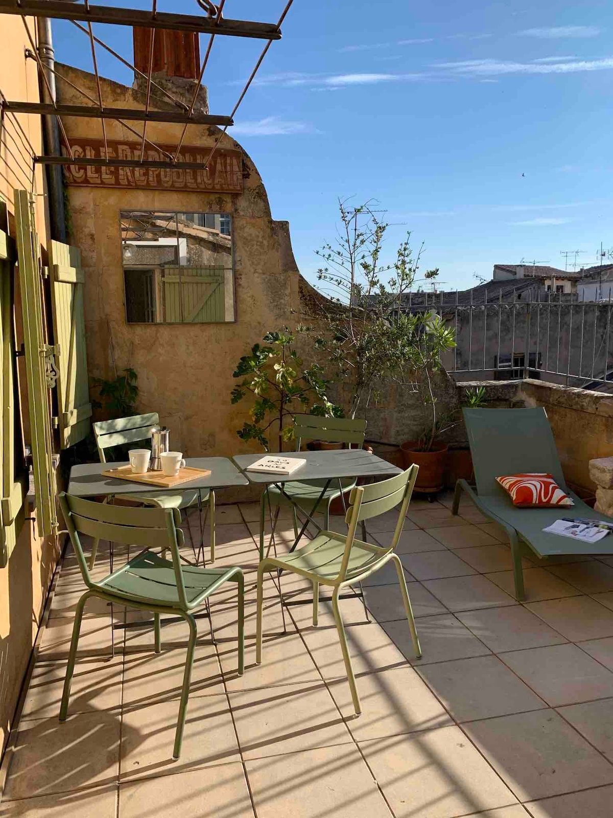 A deux pas de la Place du Forum, au calme dans un édifice du XVIème s., notre appartement est situé au 3ème étage sans ascenseur, il est pensé pour un couple ou une personne seule qui veut idéalement visiter la ville. Dotée d'une terrasse face aux tours de Saint Trophime, on y prend son petit déjeuner, des bains de soleil. Une grande pièce lumineuse, traversante et climatisée où on cuisine et on se relaxe communique avec une chambre dotée d'une douche à l'italienne. Insta : la_terrasse_du_forum