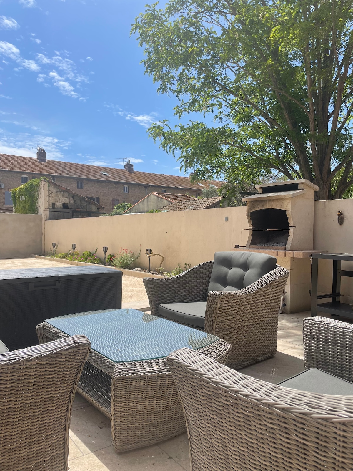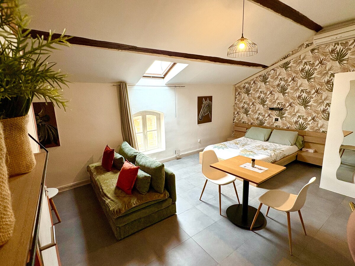 Welcome to our private oasis for 1 or 2 people in the heart of la roquette! Enjoy the heated salt water pool surrounded by tropical plants. The space will offer you a haven of shade and tranquility. Have breakfast, an aperitif, or cook poolside in the outdoor patio kitchen. The bedroom is air conditioned and equipped with luxury hotel quality bedding and organic linens, to ensure that your stay is relaxing and memorable.