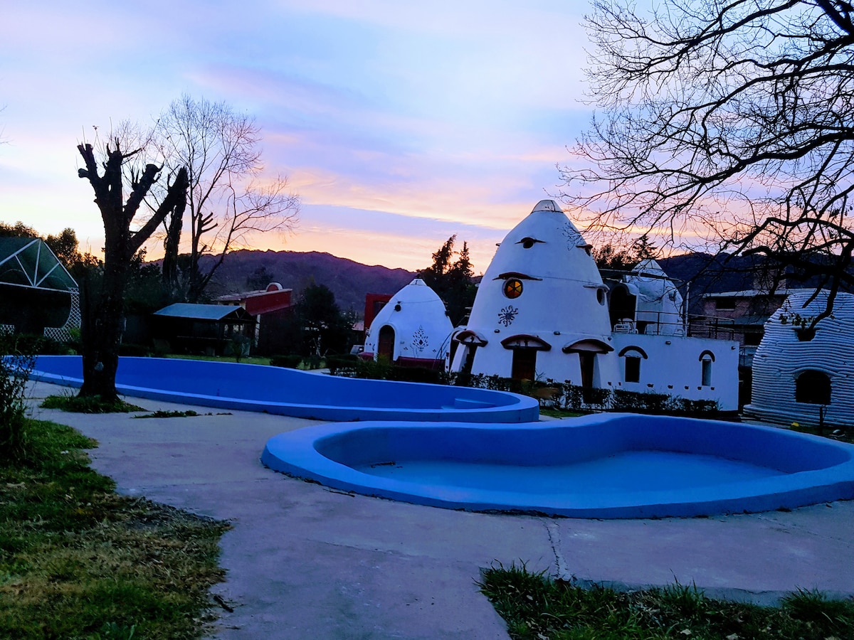 Gandalf's House ist ein rundes Ferienhaus, das für 6 Personen ausgestattet ist erdgeschoss verfügt über ein Doppelbett, einen umweltfreundlichen Herd, Kabel-TV, eine Küche und ein Esszimmer des Kühlschranks. eigener Zugang zum Badezimmer in einer anderen kleinen Kuppel wLAN kostenloser Innen- und Außenparkplatz grills und Quincho verfügbar, die Pools sind in der heißen Jahreszeit aktiviert um zu buchen, werden 30 % des Aufenthalts bezahlt. Der Restbetrag wird zum Zeitpunkt des Betreten des Komplexes storniert
