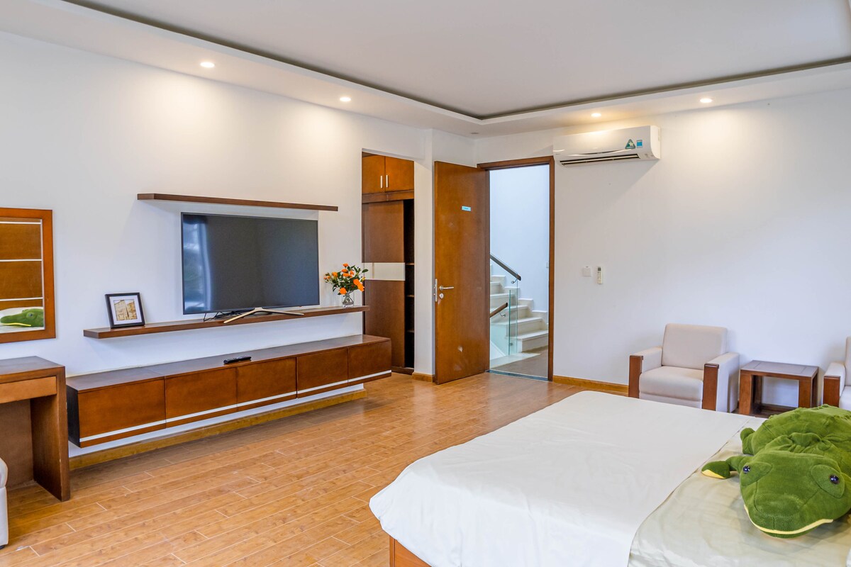 Thư giãn cùng cả gia đình tại nơi ở yên bình này. Cách bãi biển một cây số, nằm ngay bên đường quốc lộ, cách chợ chỉ hơn 100m có Winmart và chợ địa phương. Ở gần nhiều quán hải sản ngon, hoặc bạn có thể lựa chọn đặt đồ làm sẵn để thưởng thức, hoặc ra cảng biển mua đồ tươi sống về để nấu nướng cùng nhau.