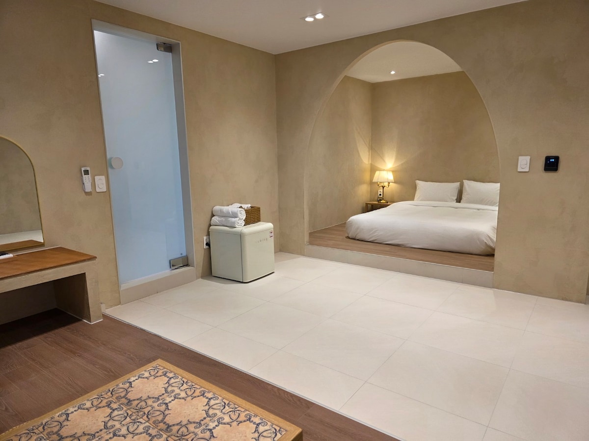 Moderner Hanok-Aufenthalt #101 Privathaus „Dreamstone Sweet Room“ Jeju Miheon, also ein schönes Haus in Jeju, ist ein minimalistischer Hanok. Diese Fusion-Hanok enthält die Sensibilität eines traditionellen Hanok, verbessert aber die Isolierung und den Komfort, was die Mängel von Hanok sind. Es hat den Vorteil, eine 6-minütige Fahrt vom Flughafen Jeju und einen 5-minütigen Spaziergang vom Yongduam Beach entfernt zu sein. Das Suite-Zimmer #101 ist ein Privathaus und basiert auf 2 Personen. Bis zu 3 Personen können dort übernachten.