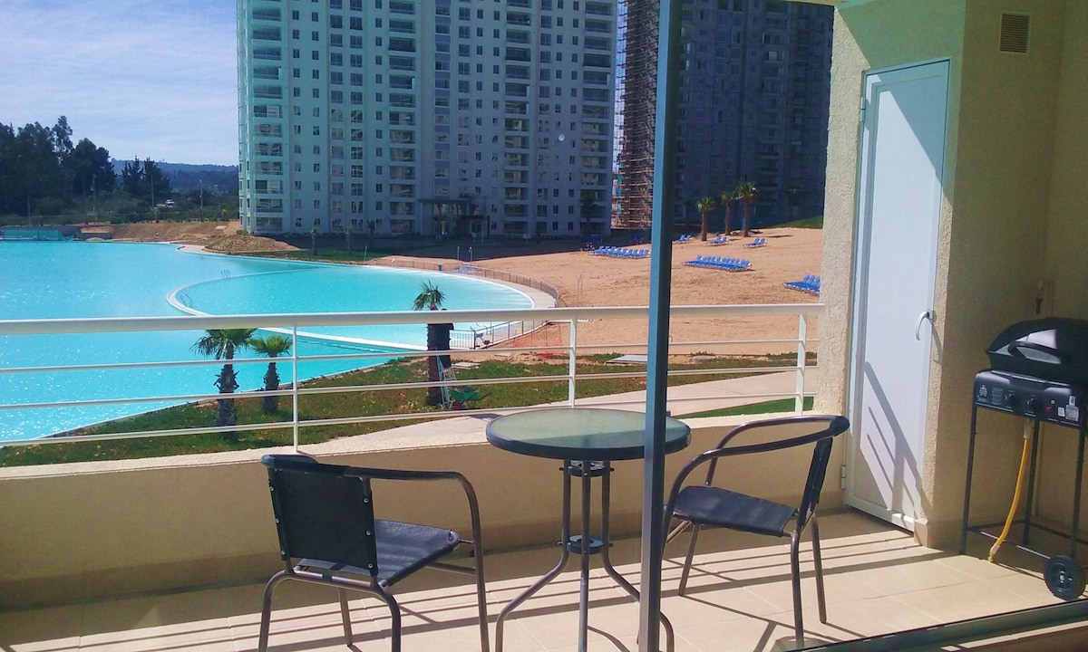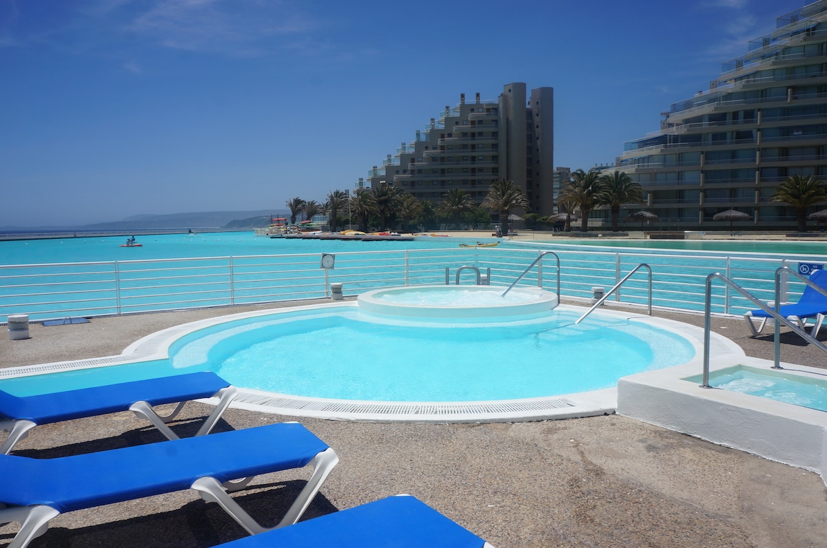 Acogedor departamento 2D+2B en tercer piso, completamente equipado para 5 personas, en primera línea frente a la laguna y con lindas vistas al mar, al complejo y puestas de sol. Sábanas y toallas incluidos en servicio. Kayak disponible para los huéspedes. San Alfonso del Mar es un lugar increíble para pasar unas entretenidas vacaciones o simplemente descansar. Destaca por tener la piscina más grande del mundo, además de contar con gran cantidad de equipamiento y servicios para los usuarios.