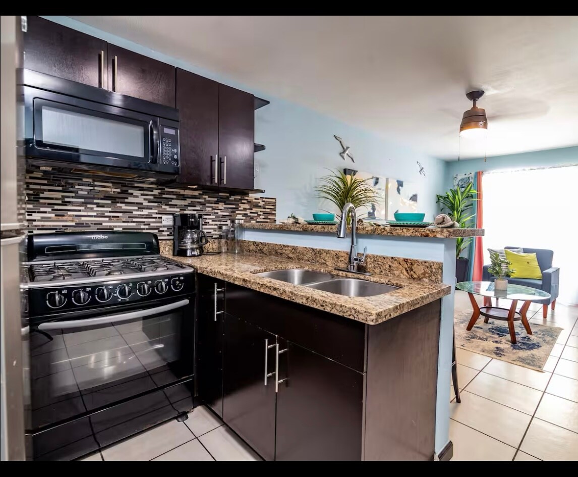 This unit has a unique style of its own. It’s fully black which makes it perfect to relax, and binging on your favorite movies/series. King size mattress and 75” TV *AC/Heater *Fast Wifi *Everything on pics fully PRIVATE Enjoy the beautiful sunset from our two-person bathtub & Terrace (Best view in the area!)🌅 Outdoor Kitchen 🍳/ Living Room with fire pit & MovieTheater! 🎥 Located inside a gated residential (24/7 security) Walking distance to local bars, Restaurants, and MalibuBeach(~1mile)