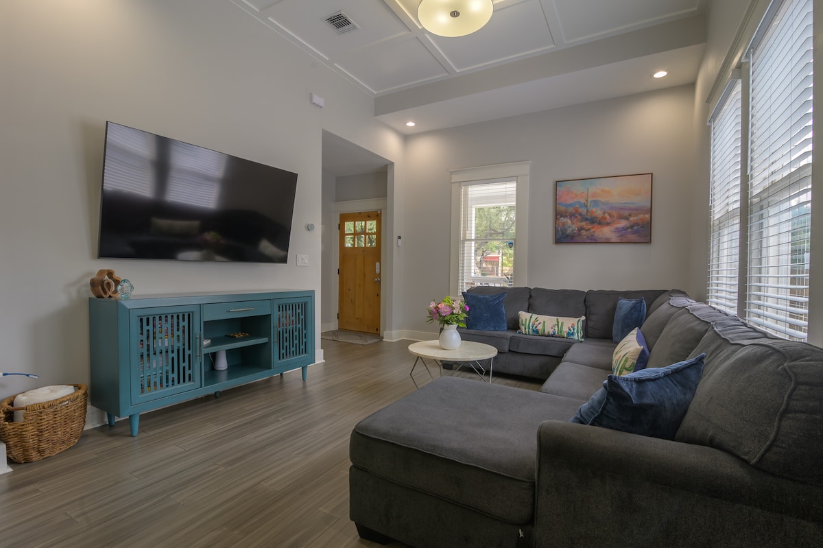 * Bitte lies dir den Abschnitt „Nachbarschaft“ unten durch, bevor du buchst! * Wähle ein Airbnb aus, von dem deine Freunde und Familie begeistert sein werden! Nur wenige Minuten vom Riverwalk, dem Alamodome und einer kurzen Fahrt vom Pearl District entfernt, ist unser Haus perfekt, um Erinnerungen mit deiner Gruppe zu schaffen! Mit einem geräumigen offenen Grundriss, vorderen und hinteren Parkplätzen, hundefreundlichen Details, einer Xbox Series S und einem großen privaten Hinterhof mit einer riesigen überdachten Terrasse gibt es viel Platz zum Entspannen, Sammeln und Genießen von San Antonio!