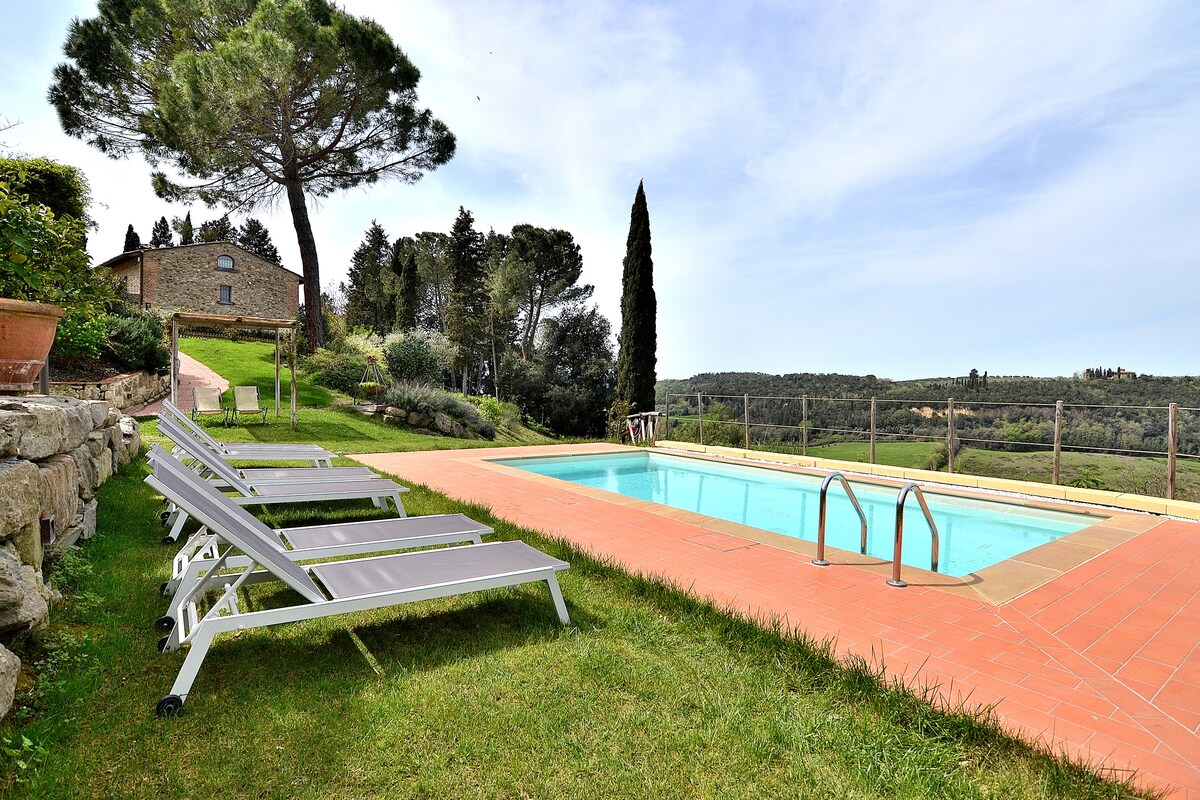Spend a holiday in the heart of the Tuscan countryside in this cozy stone house with terracotta floors and beamed ceilings in solid oak, furnished with paintings of author , equipped with all comforts. Enjoy yourself by swimming in the large infinity pool (18m X 9m, open from May 1st to October 15th for guests of Stone house use only) or relax in an armchair under the loggia, tasting a glass of Chianti wine in front of the rolling hills of vineyards, olive groves, woods and medieval villages.