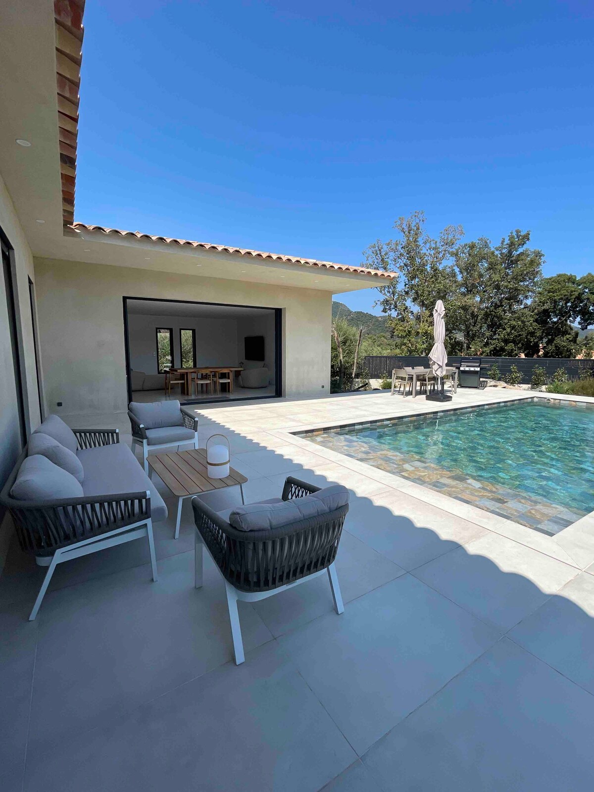 Luxusvilla mit beheiztem, gesichertem Pool, in der Nähe der paradiesischen Strände von Südkorsika Gönnen Sie sich einen unvergesslichen Urlaub in dieser schönen klimatisierten Villa, ideal gelegen, nur 10 Autominuten von den berühmten Stränden von Saint-Cyprien und Cala Rossa und weniger als einen Kilometer von den örtlichen Geschäften (Lebensmittelgeschäft, Bäckerei, Metzger, Tabakladen) in der Gemeinde Lecci entfernt. Ein elektrisches Tor sichert den Eingang mit privaten Parkplätzen innerhalb des Grundstücks