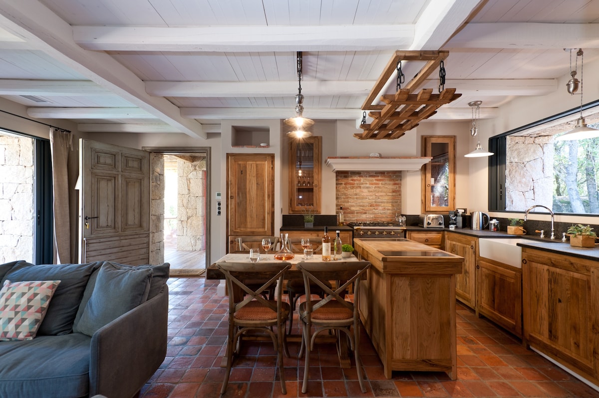 Bergerie **** aus lokalen Steinen und Kastanienholz. Im korsischen Wald, in der Nähe der Strände und Porto Vecchio, genießen Sie einen herrlichen Blick auf die Berge vom privaten beheizten Pool und drei Terrassen auf einem 2000 m2 großen Grundstück mit Bäumen Jedes Detail wurde für das Vergnügen der Augen und den Komfort entworfen, Möbel von lokalen Handwerkern, Steinboden, hoher Komfort Bettwäsche. Die Klimaanlage und der beheizte Pool (2. Mai bis 5. Oktober) ermöglichen es dir, das Haus zu jeder Jahreszeit zu genießen.