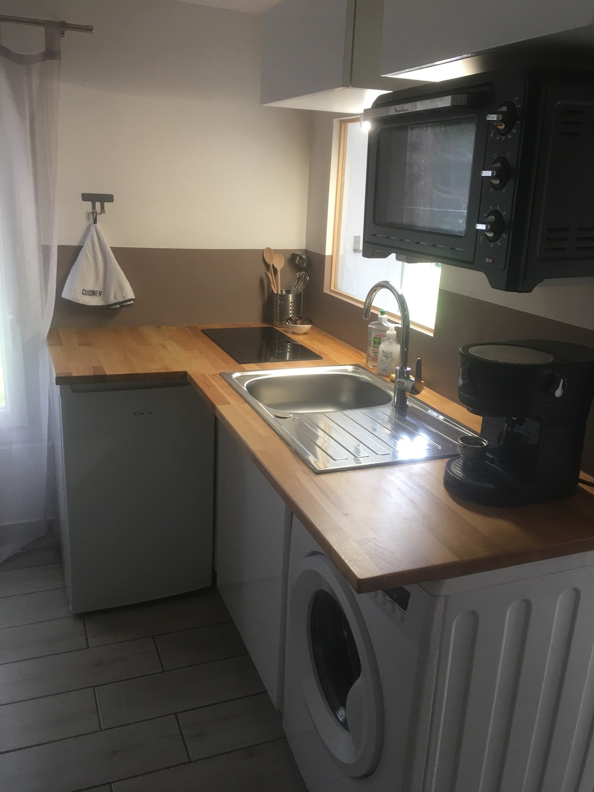 Maisonnette construite sur un lavoir, comprenant une pièce principale avec un lit en 140, coin cuisine équipé (micro-ondes, plaque de cuisson, réfrigérateur, vaisselle, cafetière filtre, bouilloire...), salle de bain avec baignoire d'angle, soupente avec deux couchages. Equipement pour bébé (Lit parapluie, chaise haute, réducteur toilettes ) disponible gratuitement sur demande.