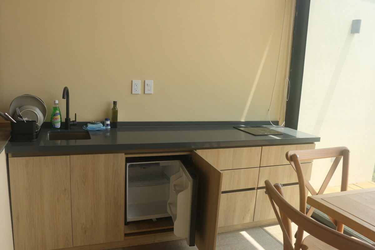 Hütte für zwei Personen, 10 Minuten mit dem Auto vom Hauptpark (2,5 km) entfernt. Es ist ein ruhiger, gemütlicher Ort, ideal zum Ausruhen, wo Sie sich von der Stadt erholen, mit dem Gesang der Vögel aufwachen und die Natur genießen können. Sie verfügt über einen komfortablen Raum, ein 1,60 m großes Bett, kostenlose Parkplätze, eine voll ausgestattete Küche, ein eigenes Bad mit Warmwasser, einen Arbeitsbereich, einen Wäschebereich mit Waschmaschine, einen Kühlschrank, einen Sound-Baffle und einen Smart-TV mit DirecTV und WLAN.