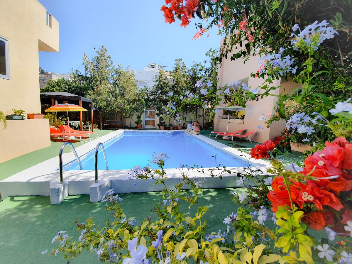 Das Jasmine Studio ist ein Studiozimmer im 1. Stock unseres Familien-Gästehauses. Es verfügt über einen eigenen Eingang (geteilt mit einem anderen Gästezimmer) eine Treppe vom Garten und Pool entfernt. Wir sind in der Nähe der Balluta Bay und aller Restaurants und des Nachtlebens von St. Julian's. Du kannst von der 5 km langen Küstenpromenade aus laufen, spazieren und schwimmen. Die ganze Insel kann mit lokalen Busverbindungen oder einem Mietwagen erreicht werden, um die nördlichen Strände und Klippenwanderungen zu erkunden. Genieße deinen Aufenthalt in Malta, Sommer oder Winter!