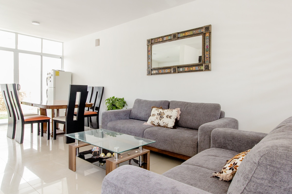 🏬Komfortabel, modern und ausgestattet, um deinen Aufenthalt zu genießen. ❄️Klimaanlage und Ventilatoren in den Schlafzimmern. 👨🏻💻Highspeed-WLAN (ideales Homeoffice) 🚘 Zwei kostenlose Privatparkplätze. 👮🏻♂️Sicherheitsdienst rund um die Uhr. 🍽️Ausgestattet mit allem, was man zum Kochen braucht Oxxo und Gerichte innerhalb des Komplexes 🛣️Am Fray Junípero Serra (Highway) gelegen 10 Minuten von Anahuac, Teleton, Hospital IMSS, Zibata, Zakia. Refugio. 10 Minuten von Antea, Paseo Qro, Uptown, La Comer, HEB, Walmart und Restaurants.