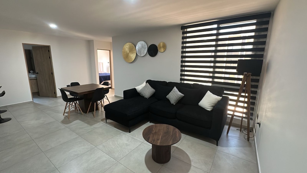 Moderne offene Wohnung, Queensize-Bett und Doppelschlafsofa. Mit großer ausgestatteter Küche und einer spektakulären Terrasse. Die Wohnung befindet sich in einem Hochsicherheitsbereich. Öffentlicher Golfplatz, Trainingsbereiche, schöne Gärten und Einkaufsmöglichkeiten. Ein komfortabler, ruhiger und harmonischer Ort, an dem du angenehme Familienmomente genießen kannst. Nur 5 Autominuten von der Universität Anáhuac entfernt, ideal für Studenten, Führungskräfte oder Urlauber.