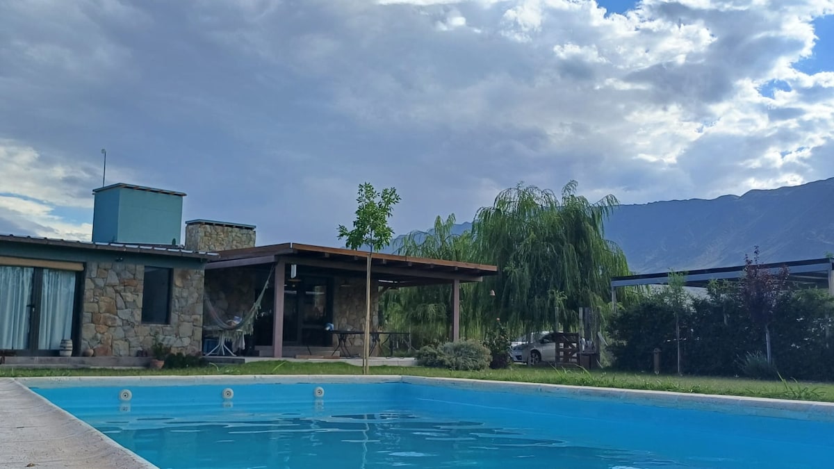 Cómoda y acogedora casa con piscina y parrillero en el jardín, ideal para hasta cuatro personas. Cuenta con dos dormitorios y un escritorio. Ubicada en un barrio residencial tranquilo, frente a Plaza Gustavo Cerati, a 7 km del centro, 10 km del Dique de Ullum y 12 km del Autódromo El Zonda. Equipada con Netflix, WiFi, calefacción por losa radiante, aire acondicionado y cochera para vehículo.