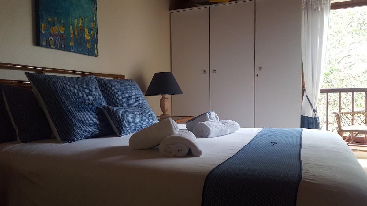 3 Schlafzimmer (1 Doppelbett, 4 Einzelbetten), 2 Badezimmer (Dusche und Badewanne) mit Meerblick. Klimaanlage in allen Schlafzimmern und Wohnbereich. Obergeschoss und Treppe im Inneren. Ausgestattet mit einem Geschirrspüler, einer Mikrowelle, einer Waschmaschine, einem Fernseher und einem WLAN. Balkon mit Braai-Einrichtung.