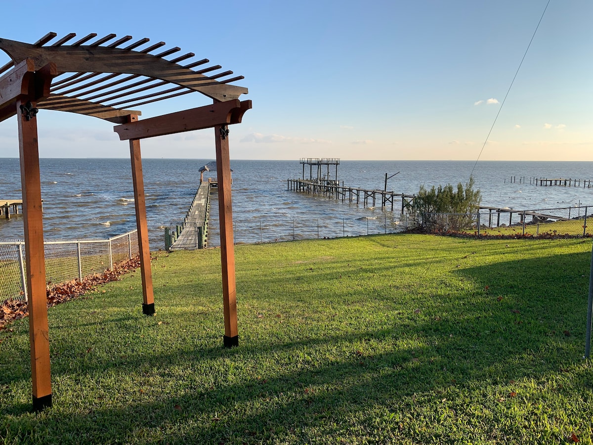 COASTAL OASIS A perfect combination of luxury and comfort! A little hidden gem, a beautifully decorated, spacious new home. While enjoying your stay, take a short stroll down the street to go fishing, relax on the porch, soak in the water view, and enjoy the spectacular sunsets. Home includes: Open-concept floor plan for you to entertain or relax, gourmet modern kitchen, private patios off each retreat. 10 mins. to Kemah Boardwalk, 25 mins. to Galveston & many top rated restaurants close by