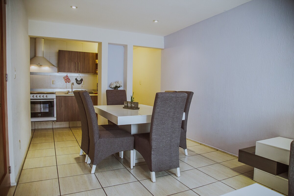 Hospédate en un departamento de una planta, hermoso y céntrico, equipado y decorado con elegancia que te ofrece un ambiente de paz y armonía. Ideal para familias o grupos, ya que tiene capacidad para 6 personas. Disfruta sus espacios confortables y funcionales en 3 recámaras, 2 baños, sala, comedor y cocina. Está en un condominio tranquilo y seguro, en pleno centro de la ciudad. Tenemos alta calificación y precio accesible. Reserva tu estancia en este hospedaje que te hará sentir como en casa.
