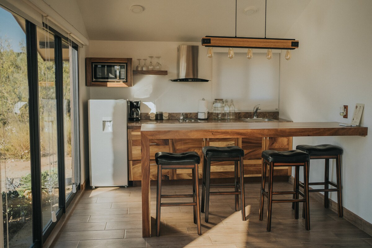 Tiny home all inclusive, bedroom over the bathroom, living room has a sofa bed too , small dinning table, kitchenette with everything you need for cooking and complementary coffee. Hot water, safe fenced area, parking space too, it’s part of a small complex, it’s very close to access from highway, has a convenience store close by and a breakfast restaurant too. Only five minutes walking distance from World renowned surf spot San Miguel. Good spot for surfers and wine country.