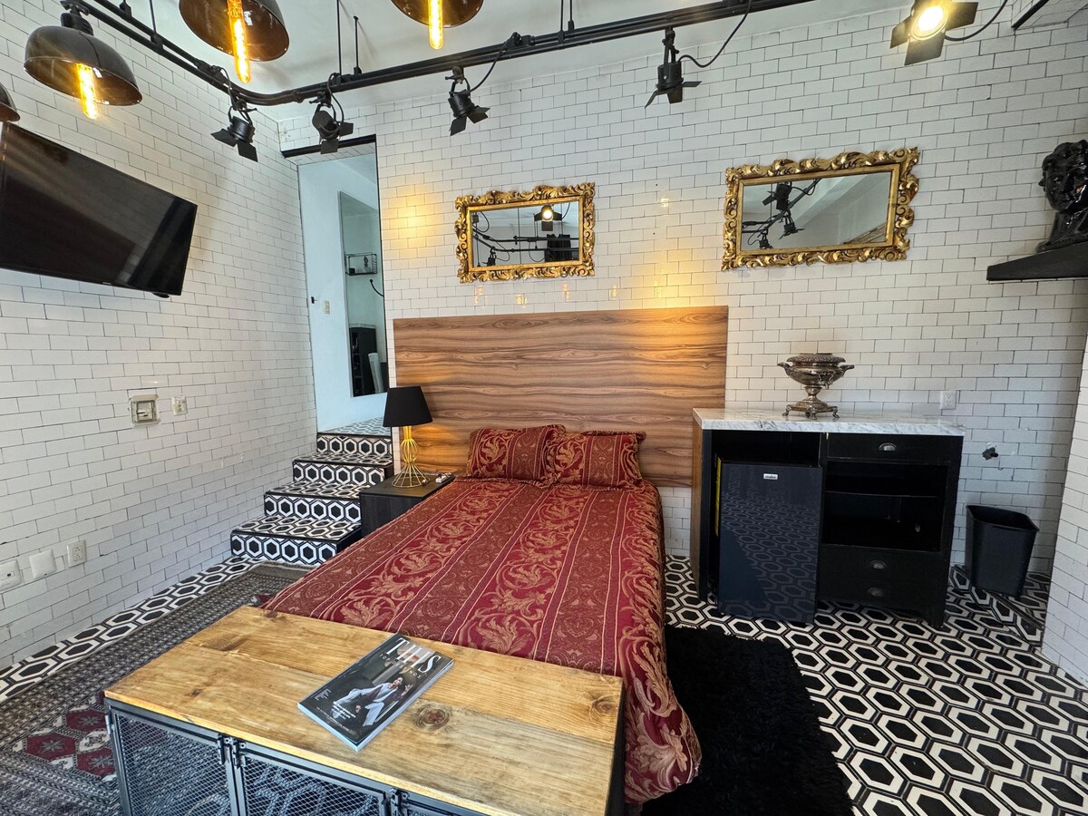 Estudio de 25 m² con carácter contemporáneo e industrial. Muros de ladrillo expuesto, iluminación escénica y una atmósfera íntima que invita al descanso. Incluye cama matrimonial, cocineta funcional, baño privado y una propuesta estética única que lo diferencia de cualquier hospedaje tradicional. Ideal para: ✔️ Parejas ✔️ Viajeros de diseño ✔️ Amantes de espacios con carácter