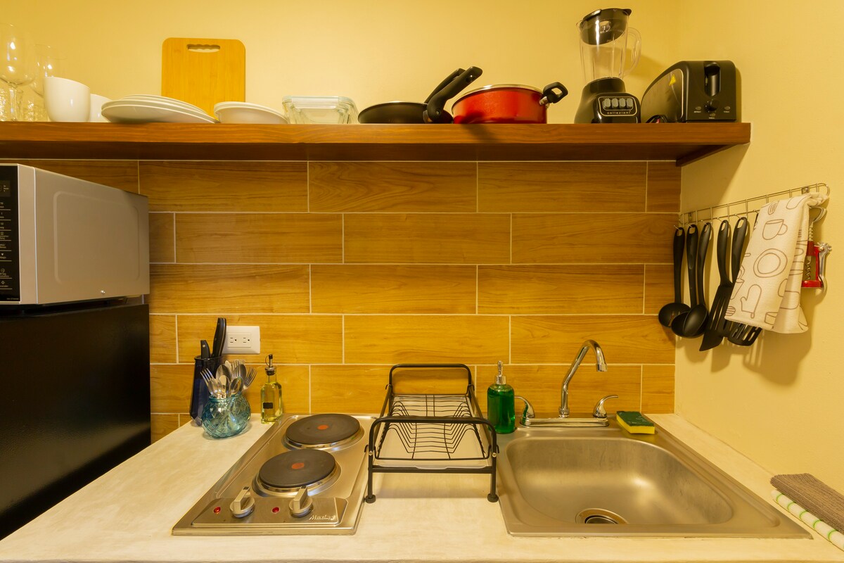 Independent ground-floor studio with all the comforts you need to enjoy Cozumel. It features a king-size bed, air conditioning, a fully equipped kitchen, a small table, a mini-fridge, a private bathroom with hot and cold water (heated by a solar water heater), and free Wi-Fi. Ideally located for saving on transportation, as restaurants, bars, and services are just steps away. On weekends, you can expect a lively urban atmosphere until around 1:30 a.m.