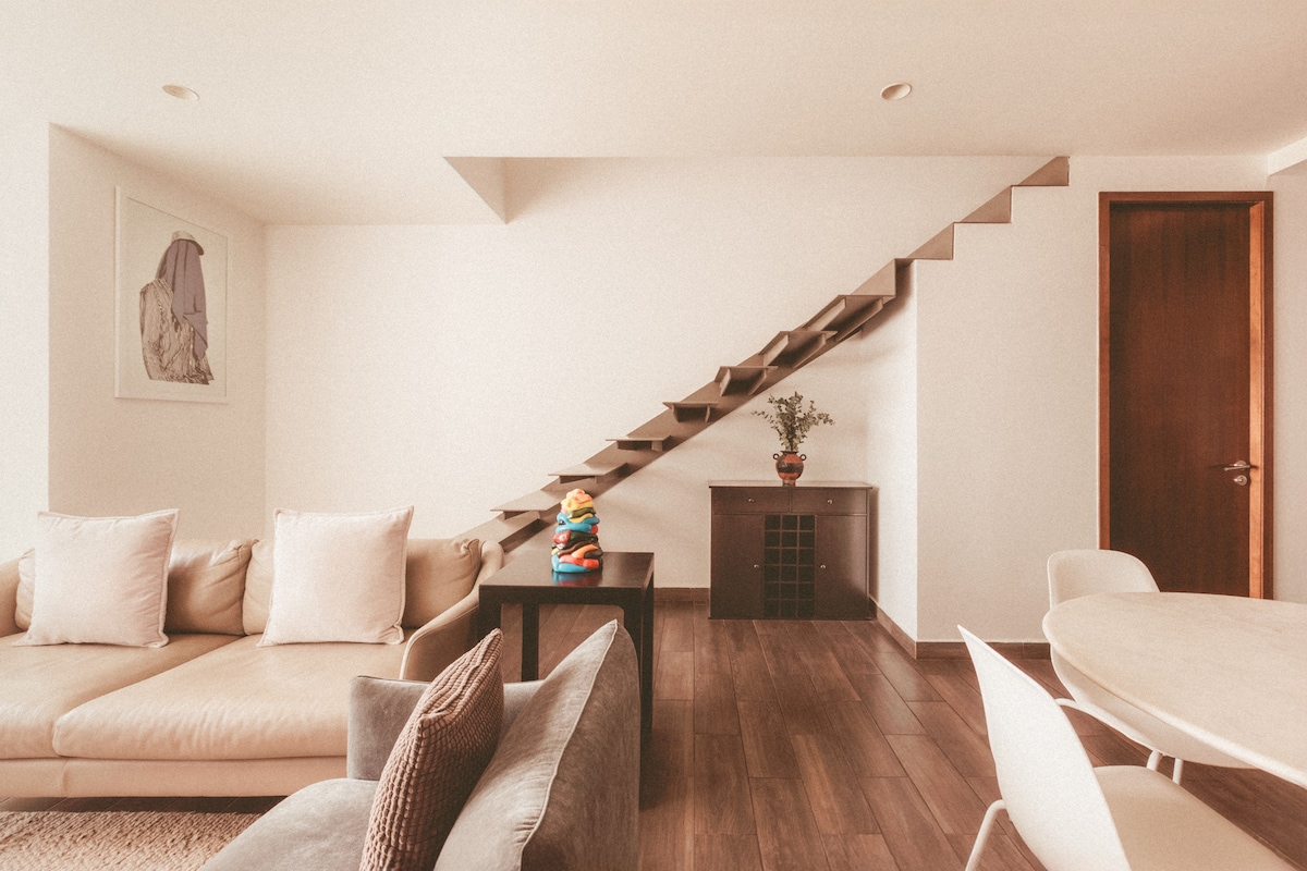 Willkommen in Coyoacán! Tolles 120 m ² Loft, nur 5 Gehminuten von der Innenstadt von Coyoacán entfernt. Erlebe das Erlebnis dieses ruhigen und hellen offenen Raums, der ideal für Ruhe oder Arbeit ist und mit Objekten voller Geschichten dekoriert ist. Das Loft befindet sich im dritten Stock der Casa Mavi, einer ehemaligen Fabrik, die umgebaut wurde, um einen charmanten Ort zu schaffen, der es einzigartig macht. Es gibt Terrassen zur gemeinsamen Nutzung. Mit Option für einen dritten Gast. WLAN 200 Mega.