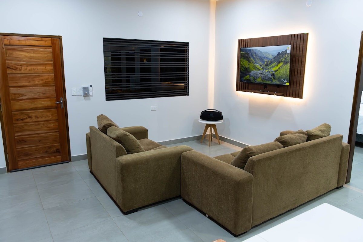 Trennen Sie sich von deinen Sorgen in diesem geräumigen, ruhigen und coolen Raum. 🏠Rustikal - modernes Zuhause, inspiriert von der Geschichte lokaler Dorfbewohner. 🏊♂️ Mit privatem Spa-Pool für ein Whirlpool. 🏕 Zugang zu grünen und vielfältigen Gärten, auch zum Camping. 😴 Ein Zimmer mit einem Doppelbett und einem Einzelbett. 🙌Ausgestattetes und klimatisiertes Wohnzimmer mit 1 sehr komfortablem Sofa. 👌Grille, um es mit Familie und Freunden zu genießen. 🐶Haustierfreundlich ♻️Umweltfreundlich