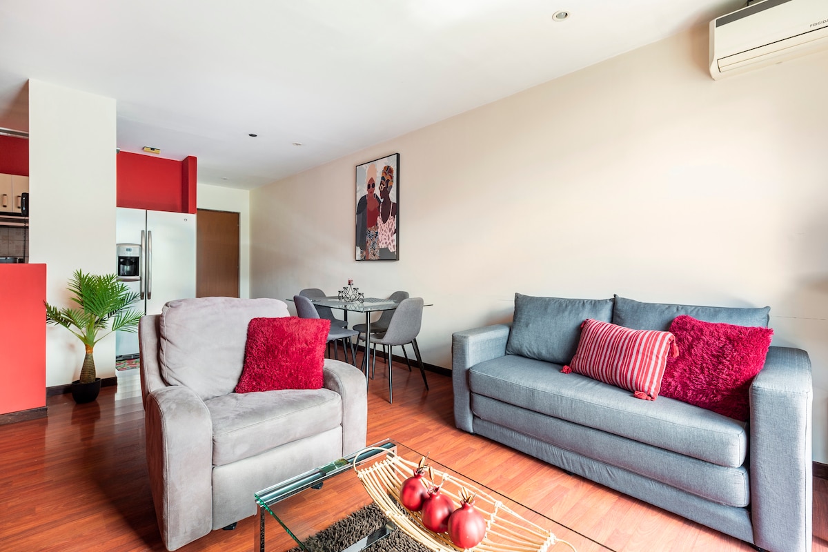 Die Wohnung ist geräumig und sehr komfortabel; jedes Zimmer ist mit einer importierten Memory-Schaum-Kingsize-Matratze ausgestattet, in die du schmilzt. Das große Sofa bietet Platz für zwei Personen. Die Dusche verfügt über einen großen natürlichen Regentropfen, der eine organische beruhigende Reinigung ermöglicht. Unsere Wohnung liegt 15 Gehminuten vom Nationalstadion entfernt und ist von Restaurants, Bars und Einkaufszentren umgeben. Zu den Annehmlichkeiten gehören private Massageräume, ein beleuchteter Pool, ein Grillplatz und ein großer Fitnessraum. Zentrale Klimaanlage und Fernseher in allen Zimmern.