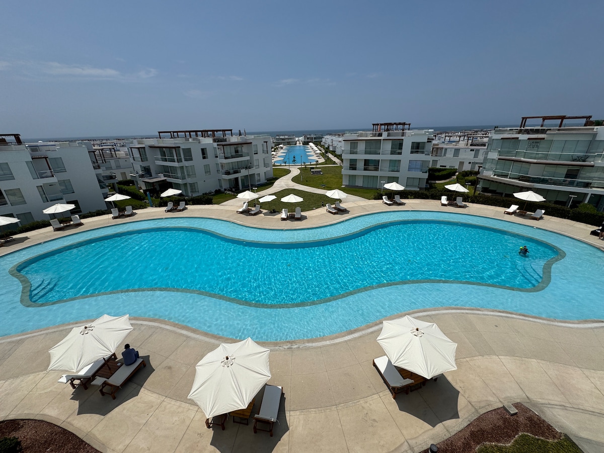 ¡Disfruta de una estadía de lujo en este exclusivo departamento! Cuenta con: 2 habitaciones 2 baños Sala-comedor Terraza con piscina interior Lavandería Cochera Además, accede a áreas comunes: Canchas de básquet, fútbol, tenis y voley net Gimnasio Ping Pong, billar y fútbol de mesa 2 piscinas con seguridad Restaurante Playa privada Juegos para niños Actividades los fines de semana Ideal para relajarte y disfrutar con familia o amigos. ¡Reserva tu escapada perfecta! (No se aceptan mascotas)