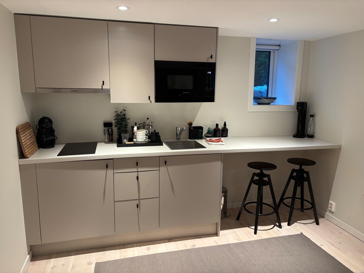 Helle und angenehme Wohnung mit 1 Schlafzimmer und Kochnische. Inklusive Doppelbett und einem Schlafsofa. Die Küche verfügt über Kühlschrank mit Gefrierfach, Herd, Backofen, Mikrowelle und Geschirrspüler. Großes und hell gefliestes Badezimmer mit Fußbodenheizung Inklusive WC, Waschbecken und Duschecke. Die Wohnung befindet sich in einer Garage im Erdgeschoss. Private Terrasse mit Sonne am Nachmittag. Dort besteht auch die Möglichkeit, eine Grillhütte zu mieten bei die Unterkunft. Verfügt über 2 Fahrräder, die gemietet werden können (5 EUR pro Tag) Einfache Parkmöglichkeiten.