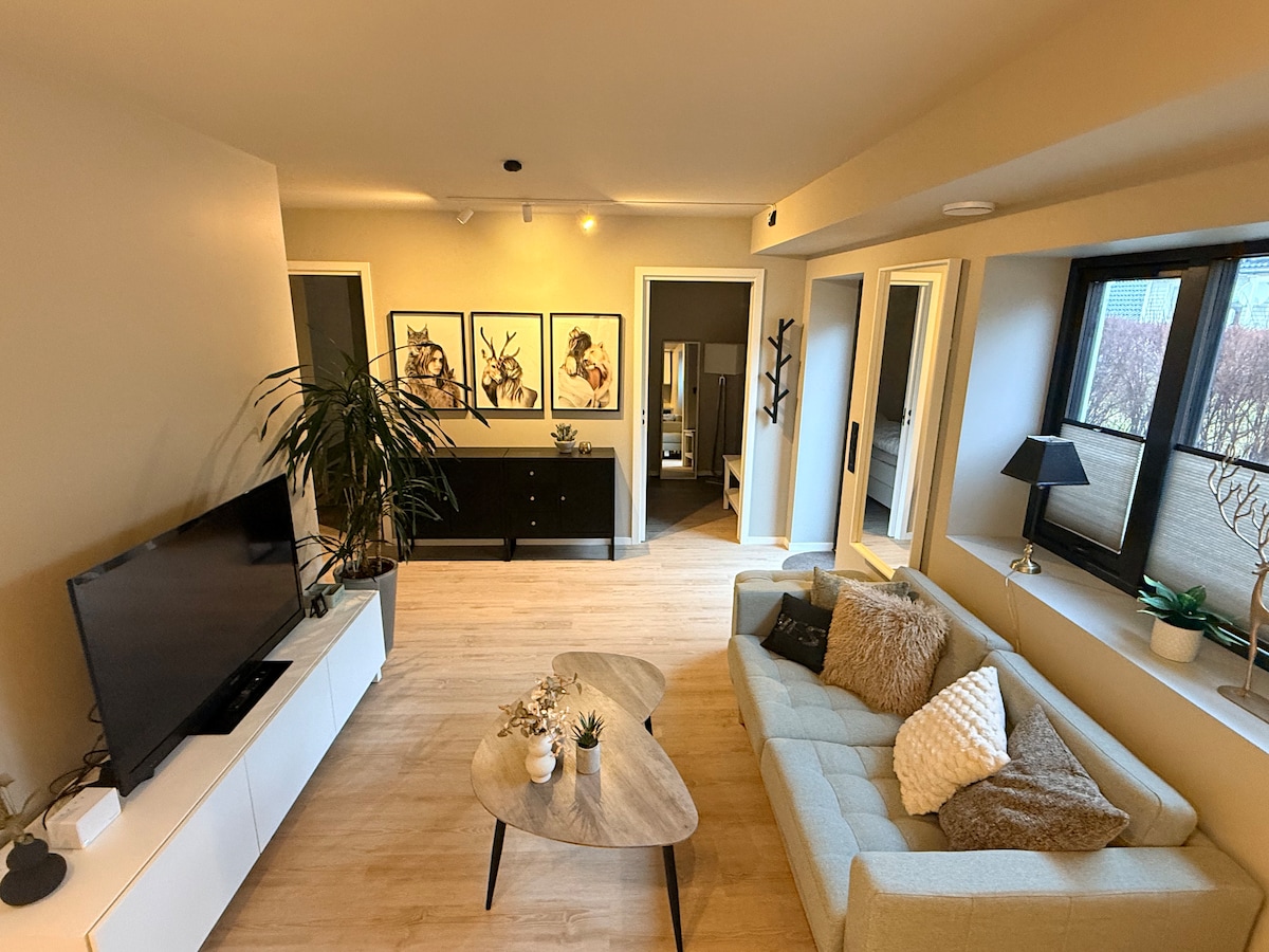 Eine moderne und komfortable Unterkunft in einer ruhigen Straße, nur 10 Gehminuten vom Bahnhof, 5 Gehminuten von den Bussen und 15 Gehminuten vom Stadtzentrum entfernt. Der schöne Sandved Park ist weniger als 10 Gehminuten entfernt, mit einem Café und einem herrlichen Bach, umgeben von Eichen. Fühle dich in unserer schönen Wohnung wie zu Hause, die mit allem ausgestattet ist, was du brauchst, und genieße den privaten Garten direkt vor deiner Haustür. 7 Minuten zu Fuß zum Lebensmittelgeschäft. 20 Minuten Zugfahrt nach Stavanger. Autobahn 2 Minuten mit dem Auto.